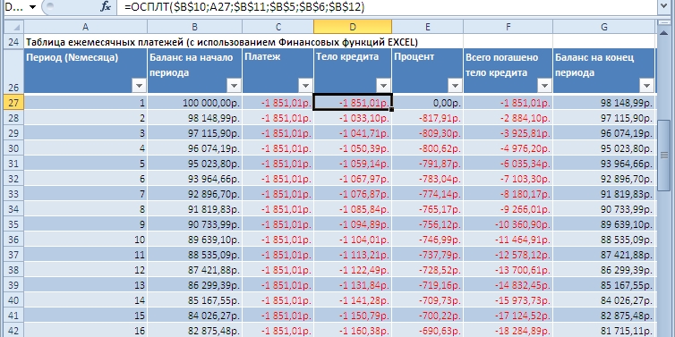 Примечание. Английская версия функции: PPMT(rate, per, nper, pv, [fv], [type]), т.е. Principal Payment - оплата основной части долга.