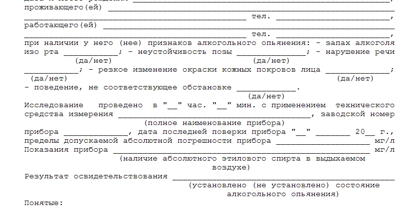 В акте о прохождении медицинского освидетельствования на алкогольное опьянение указываются следующие сведения: