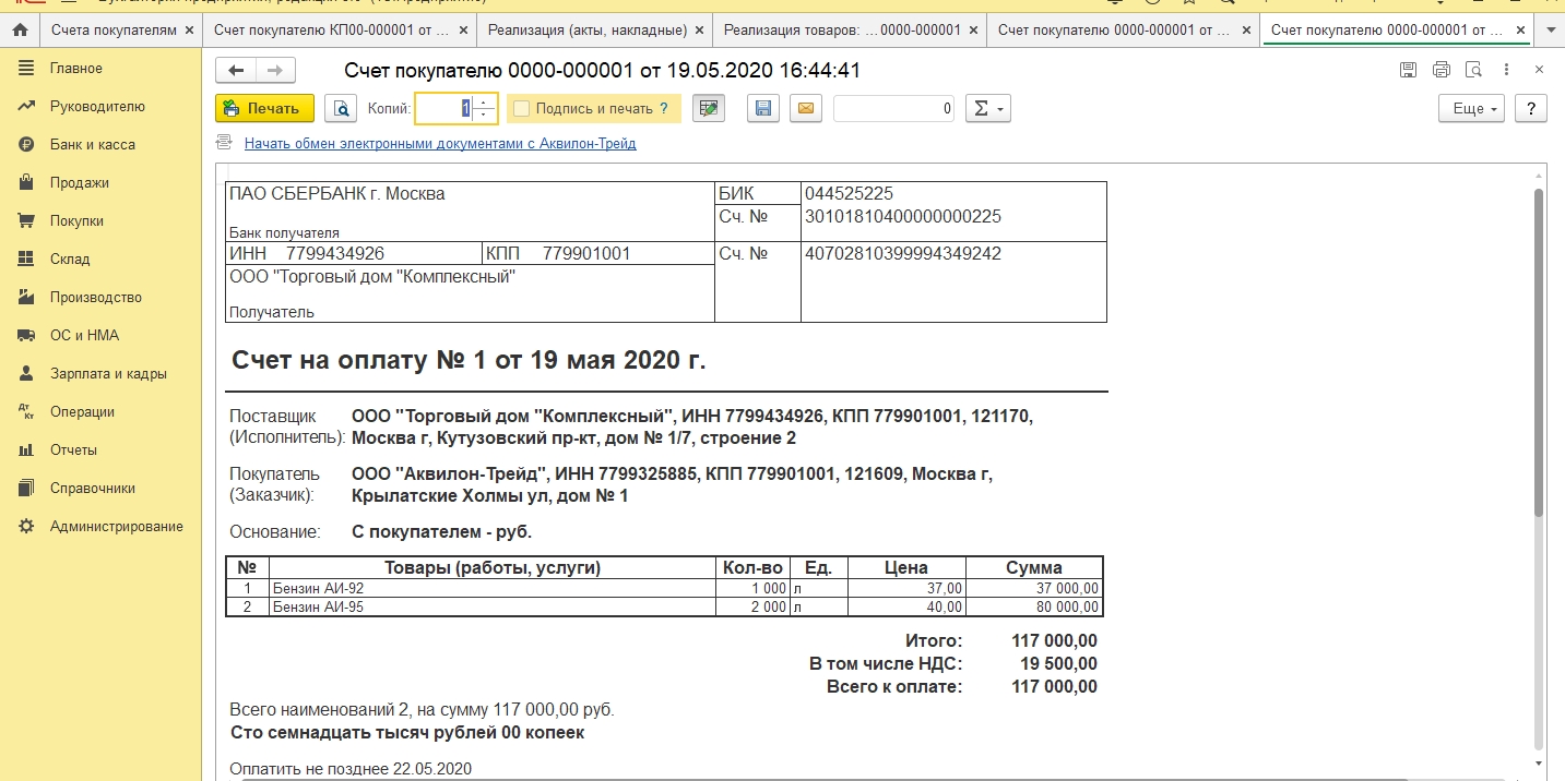 Выбрав в меню «Счет на оплату с печатью и подписями» получаем документ уже с указанными реквизитами.