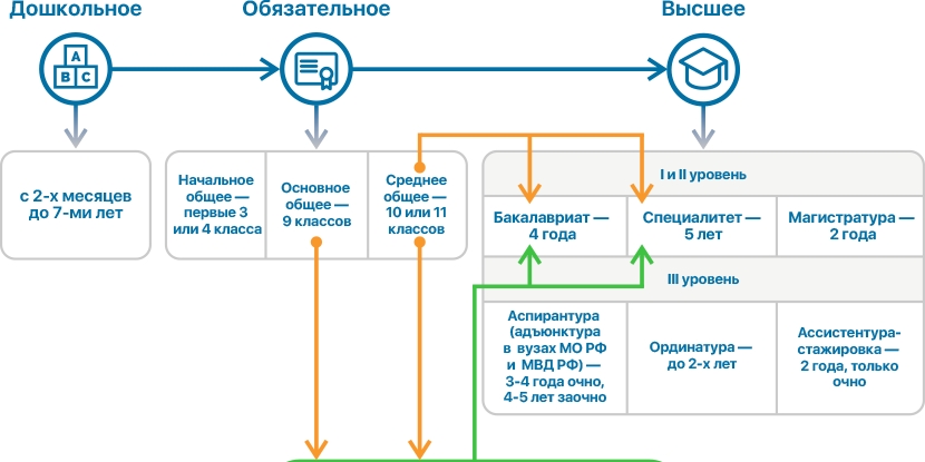 В целом в российской образовательной системе используется иерархический принцип, согласно которому образование на более высоком уровне (высшем уровне) возможно только после прохождения всех предыдущих уровней. А поскольку программы бакалавриата и специалитета являются начальным уровнем высшего образования, они доступны для граждан со средним общим образованием. Магистерские программы доступны для лиц с образованием на уровне бакалавра или специалиста, а программы последипломного образования (адъюнктура, резидентура, ассистентура-стажировка) - для лиц с образованием на уровне магистра или специалиста.
