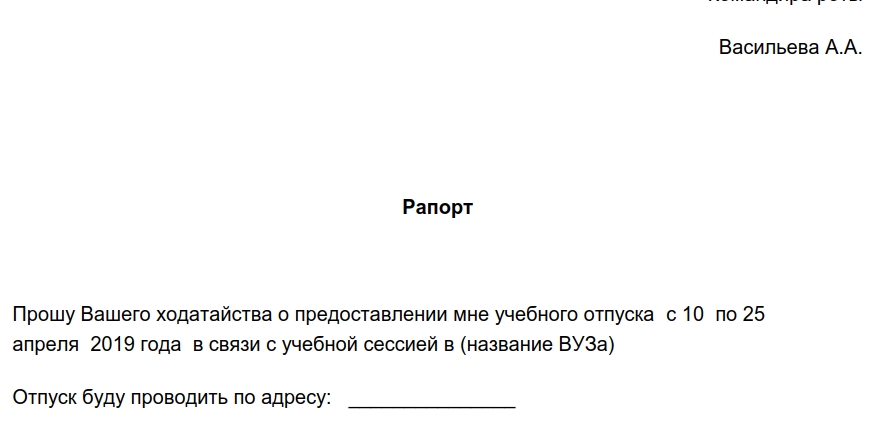 - Основная часть. Указываются причина отсутствия, время нахождения в учебном отпуске, конкретное местонахождение лица на этот период, наименование точного учебного заведения, а также справочно-вызывной номер, который необходимо получить заранее. Допускается делать ссылку на закон, предусматривающий реализацию такой возможности рассматриваемой категорией граждан.