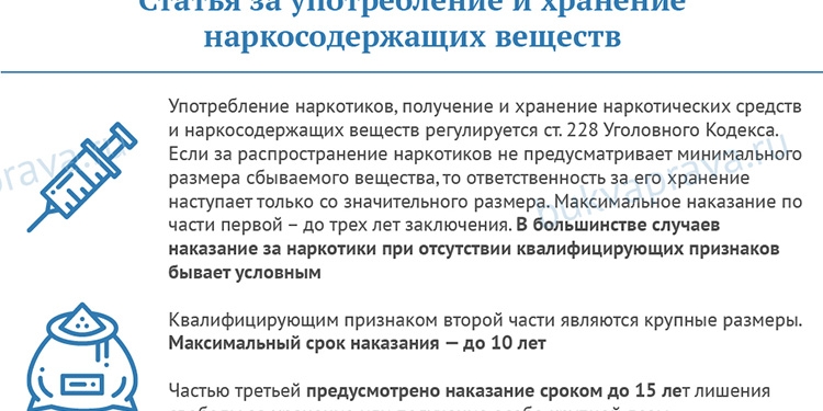 Употребление наркотиков несовершеннолетними влечет за собой административную ответственность в соответствии с российским законодательством. Искусство. 6.9 и 20.20 КРФобАП предусмотрена ответственность за употребление наркотических и психотропных средств без назначения врача. По этой же статье возникает ответственность за употребление других опасных или потенциально опасных одурманивающих веществ, оказывающих разрушительное действие на центральную нервную систему. Виновному старше 16 лет грозит административный арест на 15 суток или штраф в размере 4-5 тысяч рублей. Если несовершеннолетний, не достигший 16-летнего возраста, виновен в употреблении наркотиков, то его родители или лица, их заменяющие, несут ответственность по закону. Статья 20.22 КоАП РФ предусматривает штраф для родителей в размере 1500-2000 рублей. По факту употребления наркотиков несовершеннолетним возбуждается уголовное дело с целью установления лица, сбывшего наркотики ребенку.