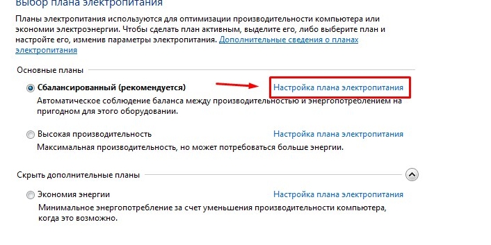 - Напротив включенного режима нажмите на ссылку. Если у вас включен режим «Энергосбережение», советую выключить его и переключить на «Сбалансированный».