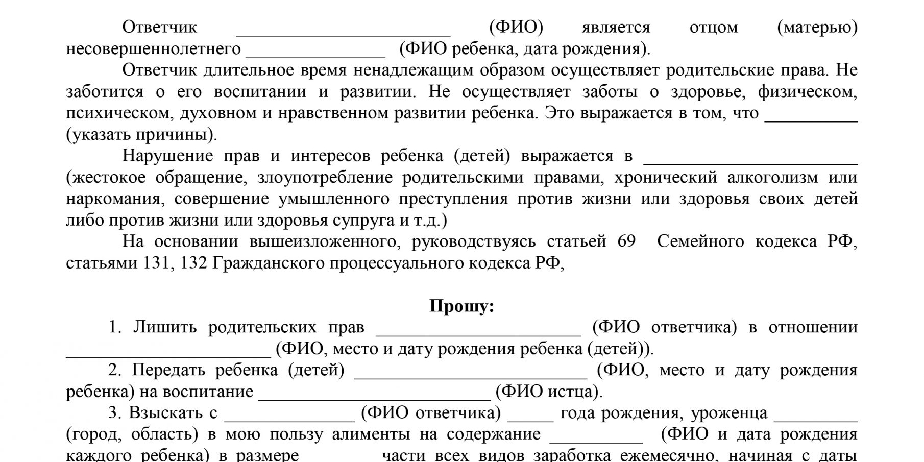 Установленного образца искового заявления о лишении родительских прав нет. Однако гражданское законодательство предъявляет строгие требования к исполнению исковых заявлений.